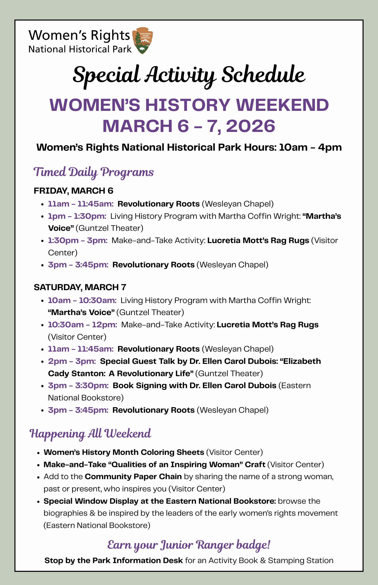 Women’s History Weekend will feature a special guest speaker and living history programs; ranger talks in the Wesleyan Chapel; fun make-and-take activities; and more to honor the legacies of the women organizers of the first Women’s Rights Convention in Seneca Falls.